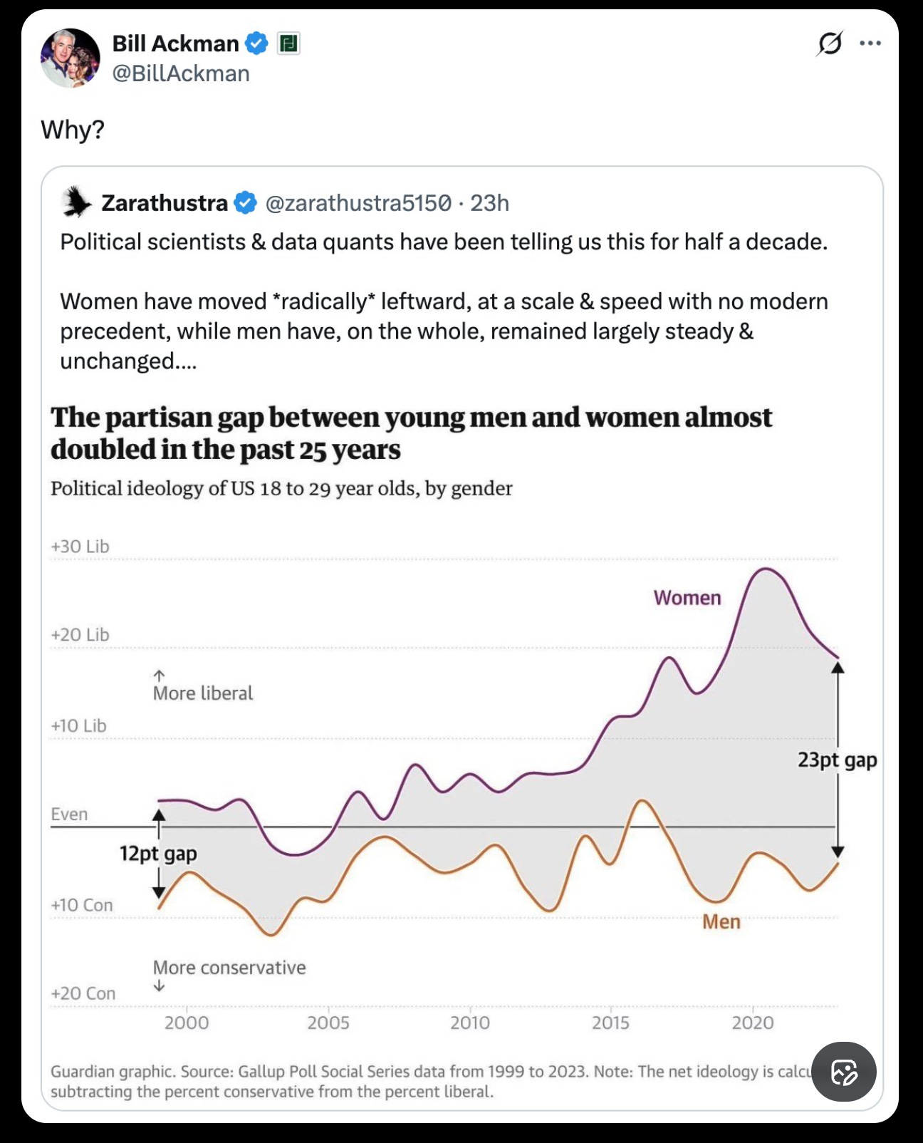 Bill Ackman quote tweeted a graph showing the partisan gap between young men and women almost doubled in 25 years.